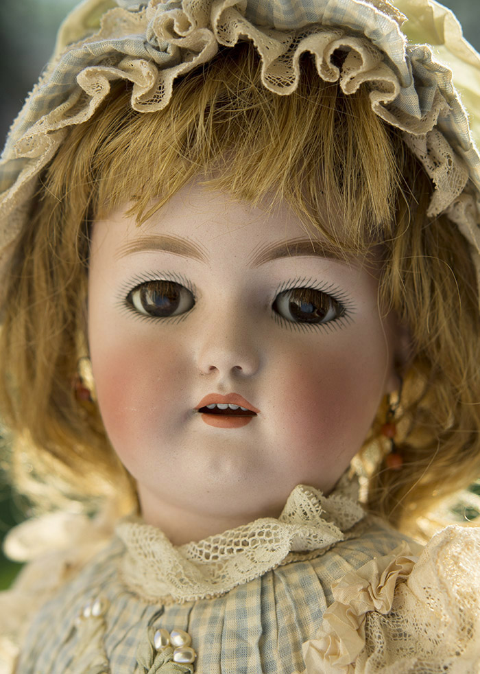 Фарфоровая голова в отличном состоянии, без сколов, трещин и "волосинок". Проколотые уши (кукла носит сережки), спящие глаза с отлично сохранившимися ресницами. Парик старинный, из натуральных волос. Родные ботиночки и носки, а также белье. Платье и шляпа - не оригинальные, изготовлены из старинных материалов с использованием антикварного кружева. Высота куклы 54 см. На затылке маркировка W.S.K.4, Simon&Halbig. Внимание! ДЛЯ ПРОСМОТРА МАЛЕНЬКИХ КАРТИНОК В БОЛЬШОМ РАЗРЕШЕНИИ, сначала щелкните на большую первую фотографию, и далее используйте кнопку NEXT, всплывающую в правом верхнем углу. Возможна покупка в рассрочку и пересылка в любой город почтой ЕМС. Справка о производителе Маркировка WSK 4 - это компания Wiesenthal,Schindel, Kallenberg, которая располагалась в городе Walterhausen и выставляла своих кукол на всемирной выставке в Чикаго в 1893 году. Для продвижения своей фирмы выпускала кукол высокого качества, иногда заказывая кукольные головы у лучших немецких фирм. В данном случае голова была изготовлена фирмой Simon&Halbig по заказу W.S.K. Стоимость: продано. По вопросам покупки, пожалуйста, звоните по телефону 8-911-926-5053 или пишите на .