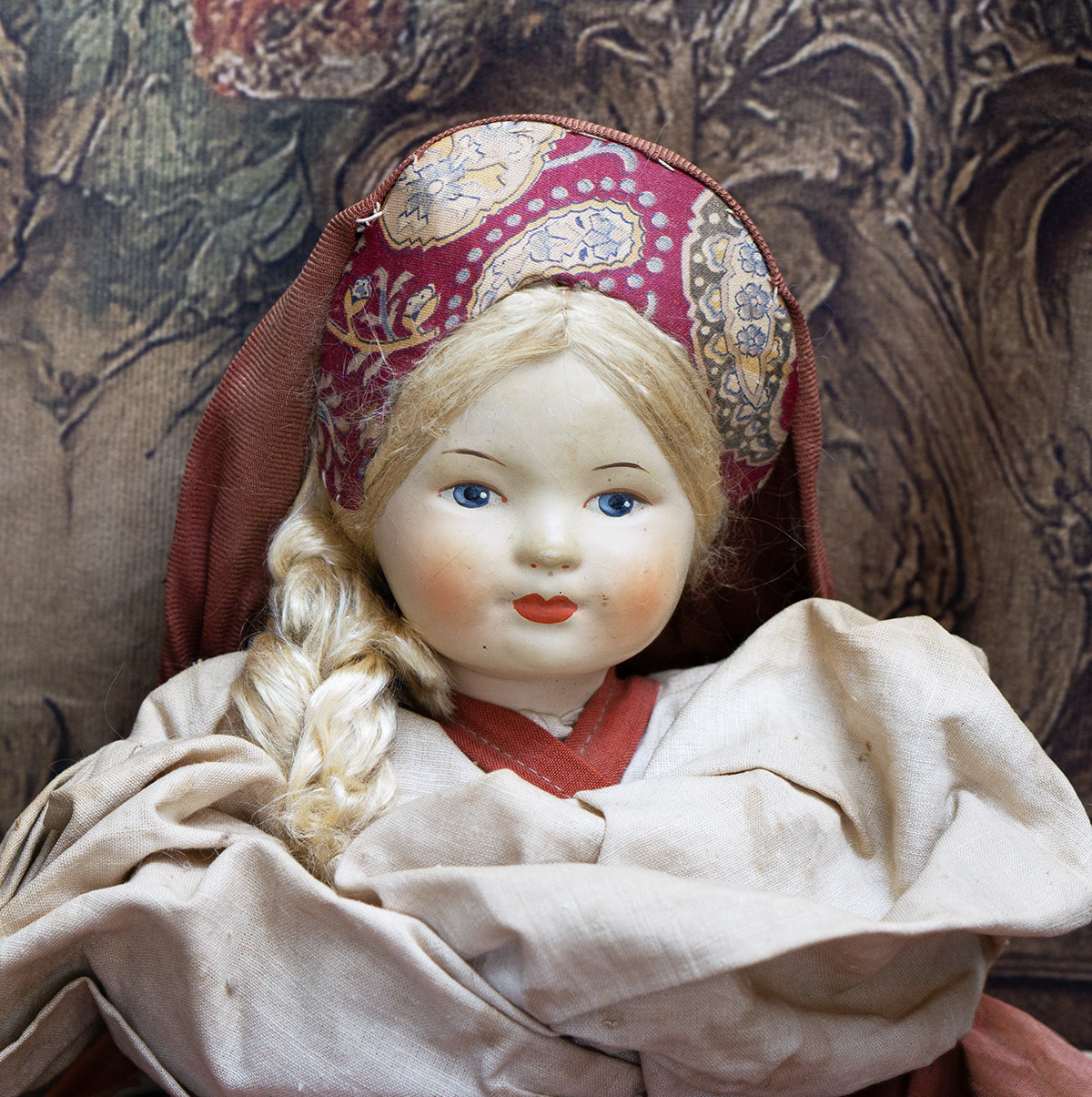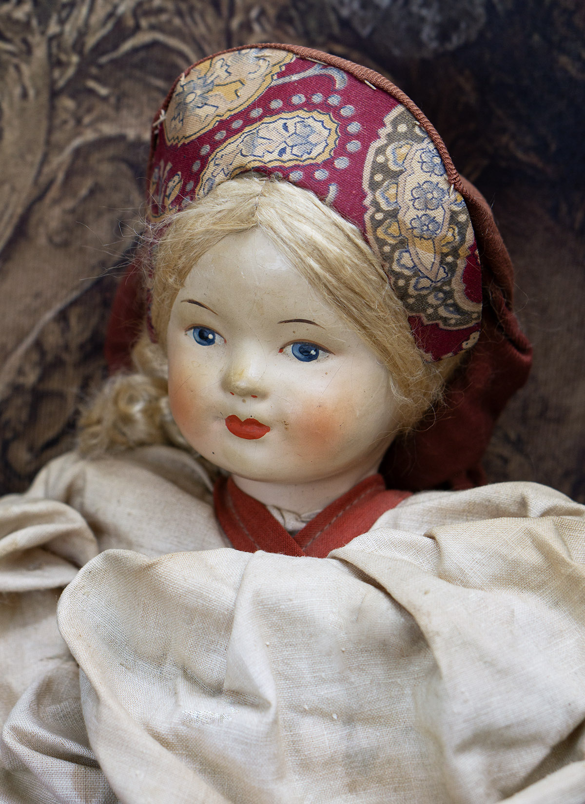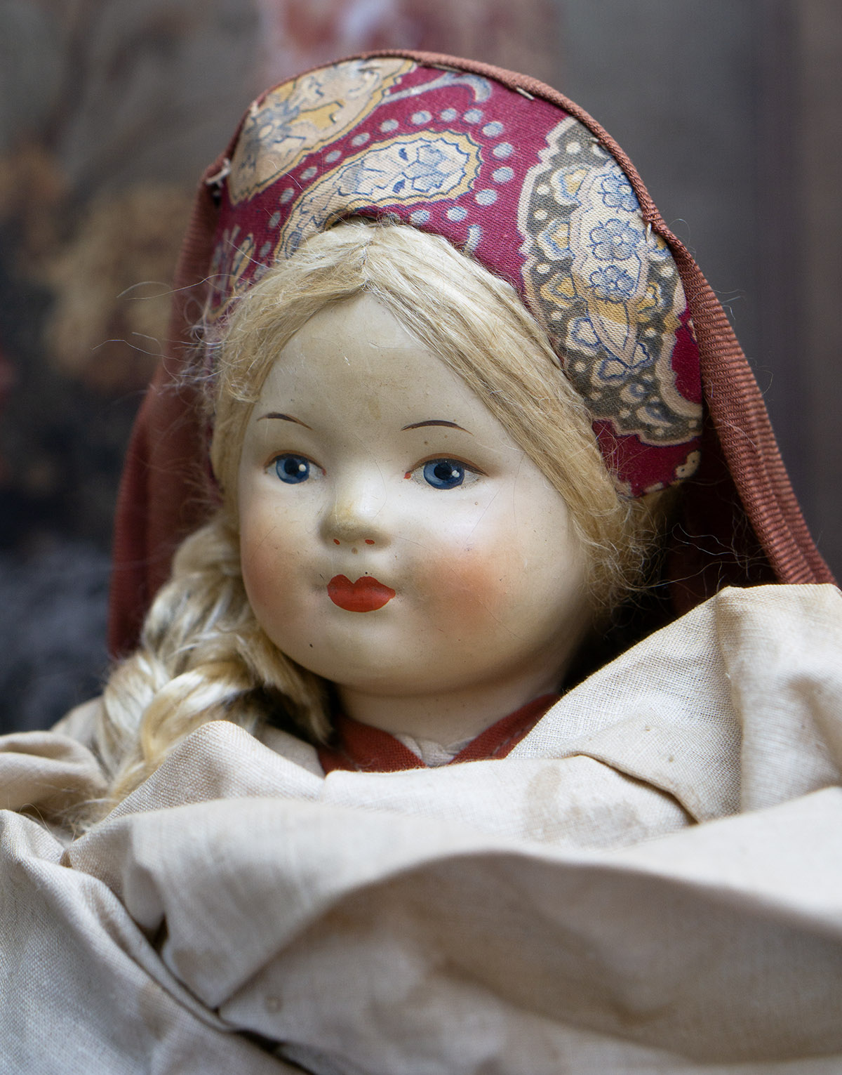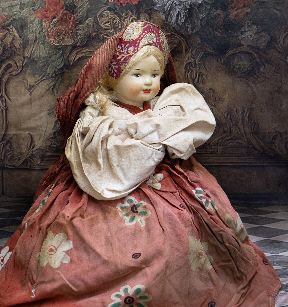 У куклы полностью оригинальный костюм (сарафан немного выцвел от времени), оригинальный мохеровый парик, голова из композита, ручная роспись лица.