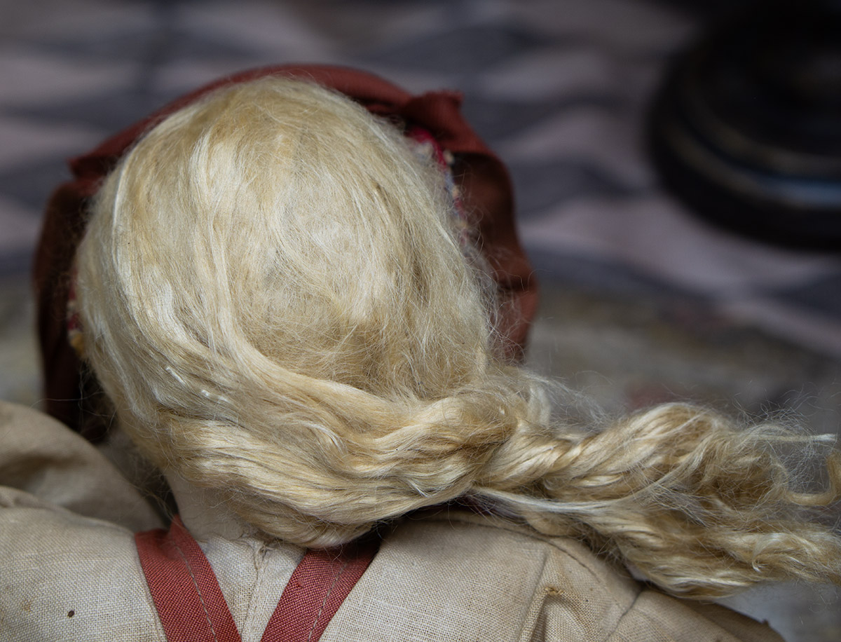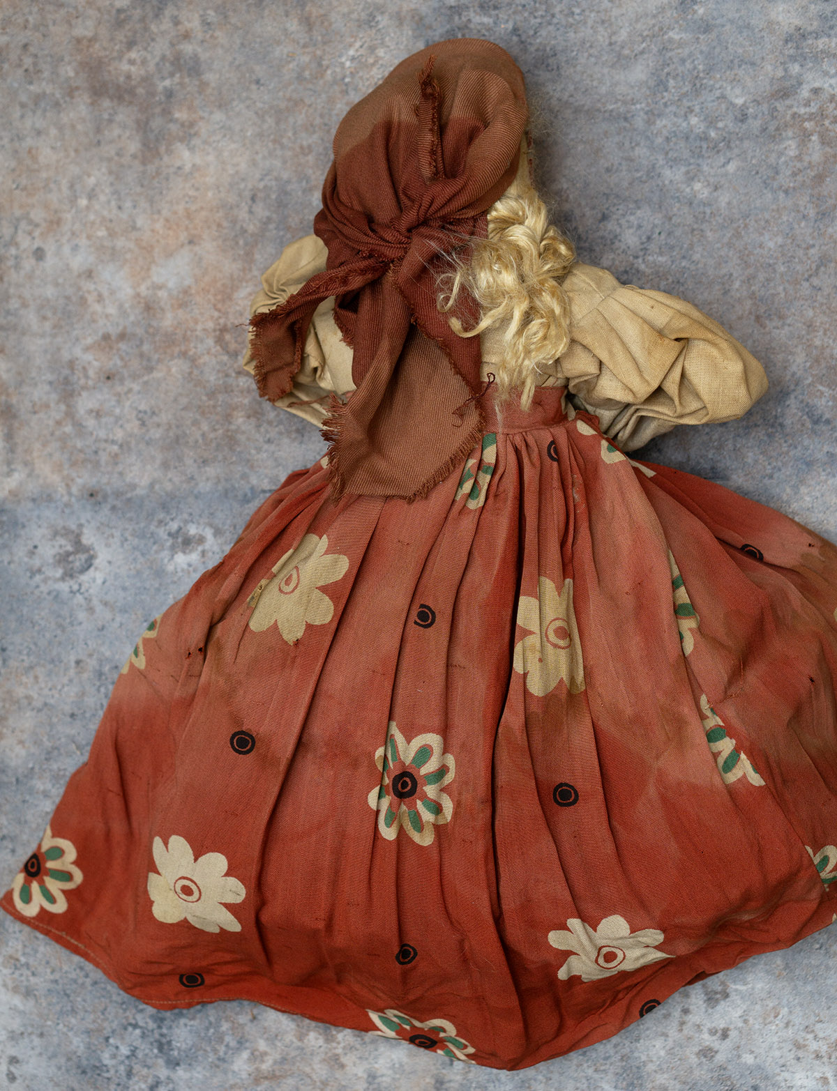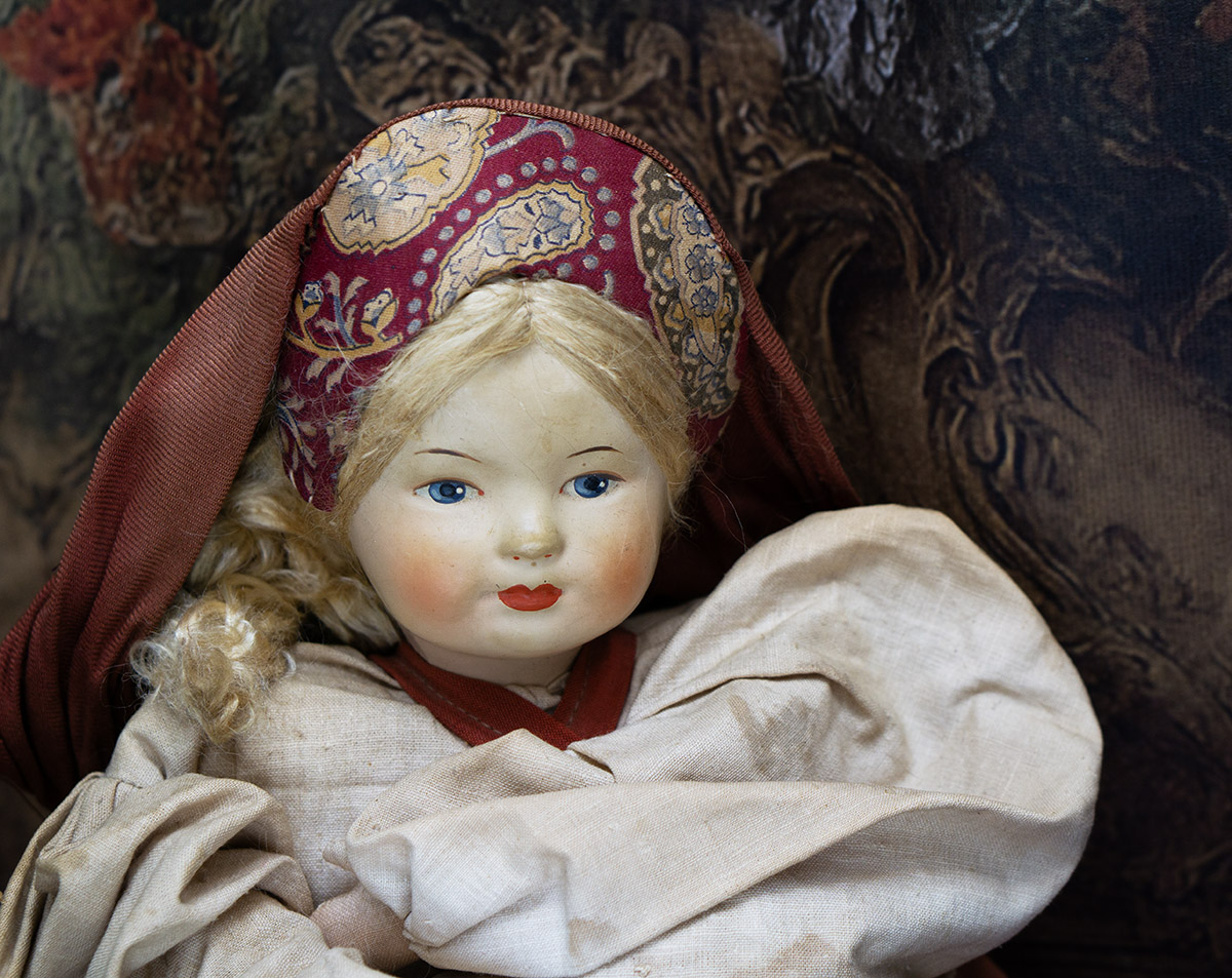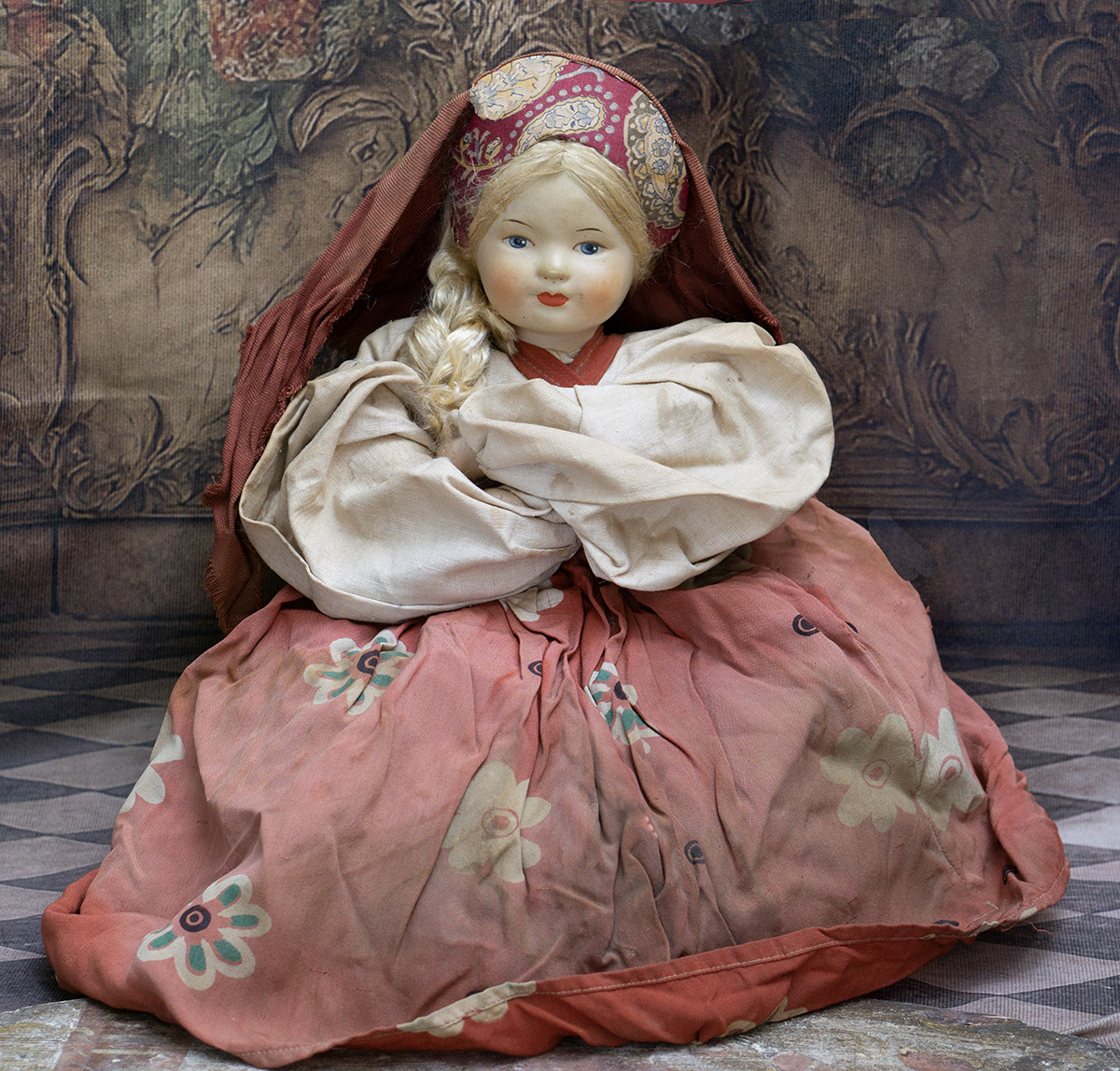 У куклы полностью оригинальный костюм (сарафан немного выцвел от времени), оригинальный мохеровый парик, голова из композита, ручная роспись лица.