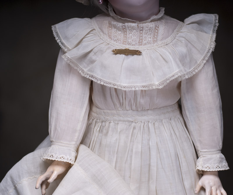 Фарфоровая голова в идеальном состоянии, голубые спящие глаза, вручную расписанное лицо, приоткрытый рот с зубками, проколотые уши (кукла носит сережки), оригинальный мохеровый парик, старинные носки и ботинки, а также белье. "Родное" батистовое платье с вышивкой и кружевами, застегивается сзади на перламутровых пуговках. Тело из дерева и композита, в отличном состоянии. Нет никаких недостатков! Высота 60 см, на затылке маркировка "S&H 1249 DEP Germany 11". Кукла была изготовлена для французского рынка. Возможна покупка в рассрочку! Пожалуйста, обращайтесь с вопросами. Справка о производителе Simon&Halbig, Германия, 1900-е годы Стоимость: Продано- Т.С.. По вопросам покупки, пожалуйста, звоните по телефону 8-911-926-5053 или пишите на .